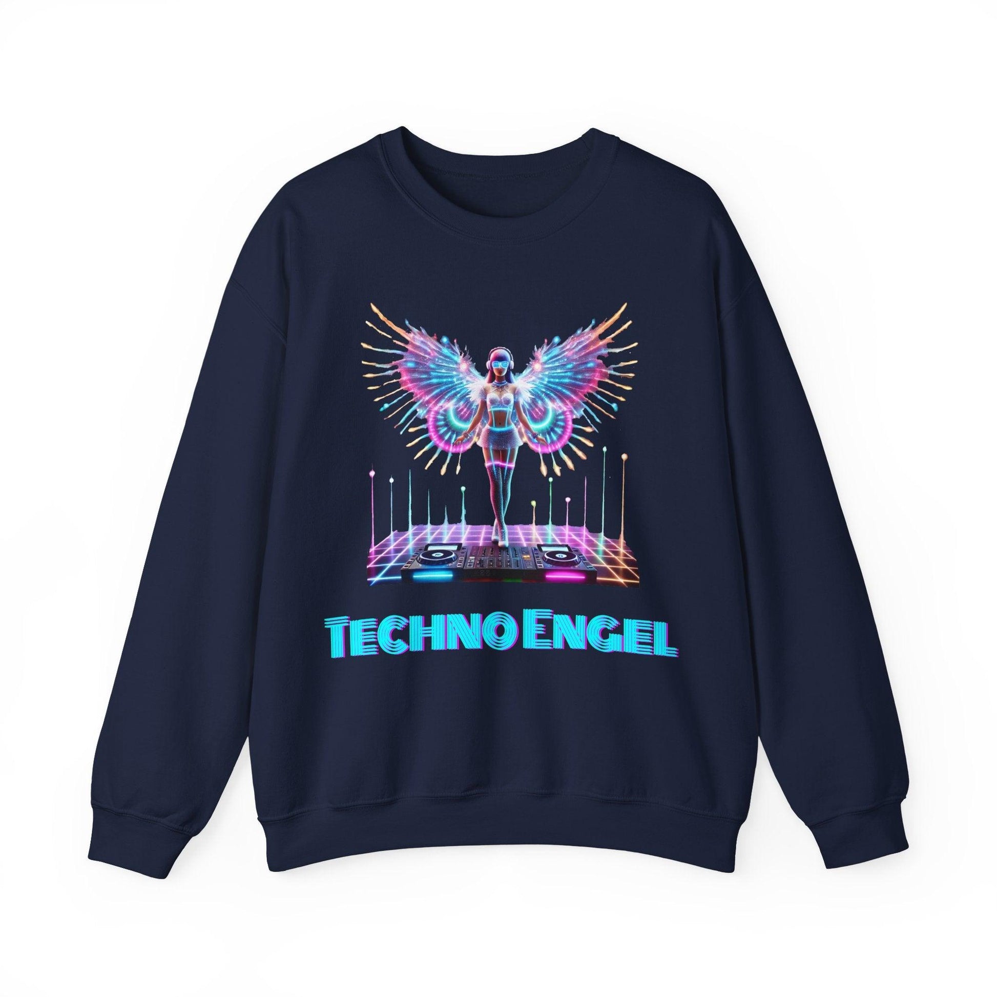 Ein moderner Party-Engel mit LED-Flügeln, die in verschiedenen Farben blinken, steht auf einem DJ-Pult und verbreitet positive Vibes. Die Flügel ändern ständig die Farbe, um sich der Musik anzupassen, und hinterlassen Lichtspuren in der Luft. Der Engel trägt eine futuristische Sonnenbrille mit einem eigenen LED-Streifen. Der Engel scheint über der Menge zu schweben. Dieses Sweatshirt strahlt eine fröhliche und lebendige Atmosphäre aus, ideal für Musikfestivals, Raves und Partys. Perfekt für alle, die einzigartige und auffällige Designs lieben.