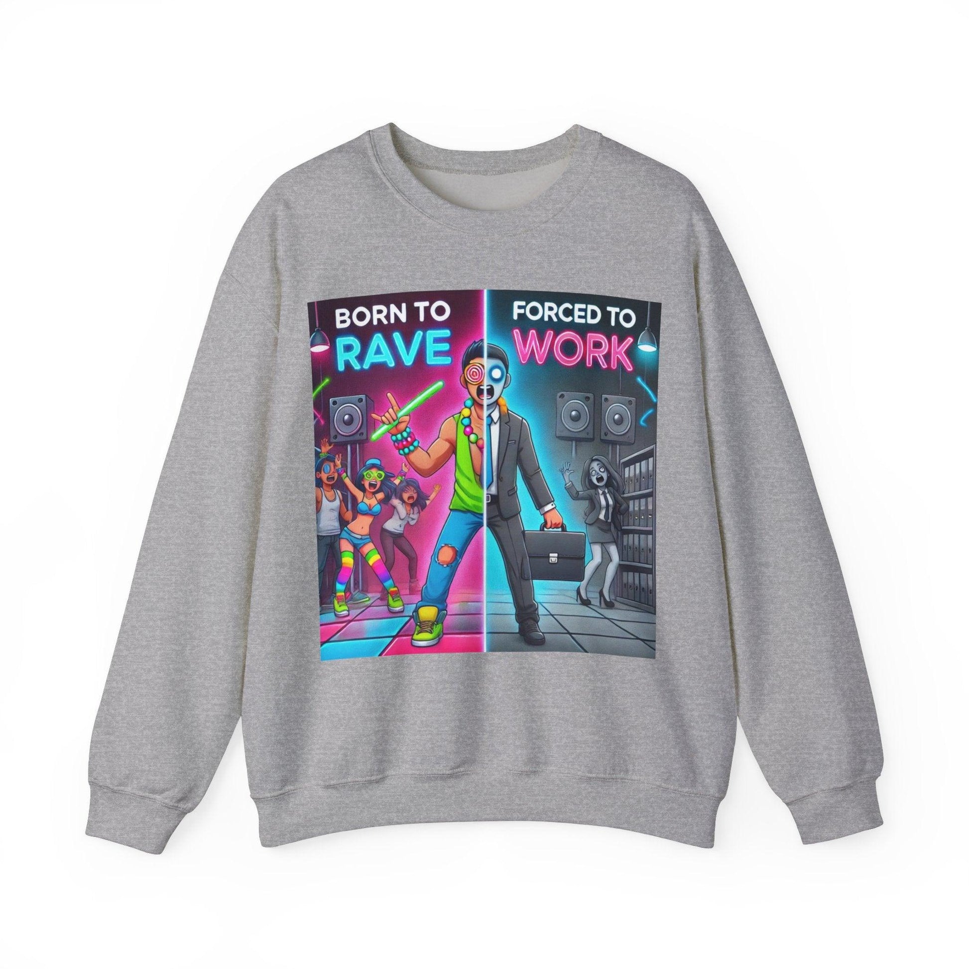 Dieses Sweatshirt zeigt ein Design, das perfekt zu dem Spruch „Born to rave, forced to work“ passt. Es zeigt eine Figur, die in zwei Hälften geteilt ist: Eine Seite feiert in Neonfarben, während die andere Seite in grauer Business-Kleidung erschöpft wirkt. Dieses Sweatshirt versprüht eine lustige und schräge Stimmung, ideal für alle, die gerne feiern, aber auch das Arbeitsleben unter einen Hut bringen müssen. Es ist perfekt für Raver, Partygänger und alle, die ein bisschen Humor in ihrer Kleidung schätzen. Ideal für Musikfestivals, Partys, Casual Fridays und Geburtstage.