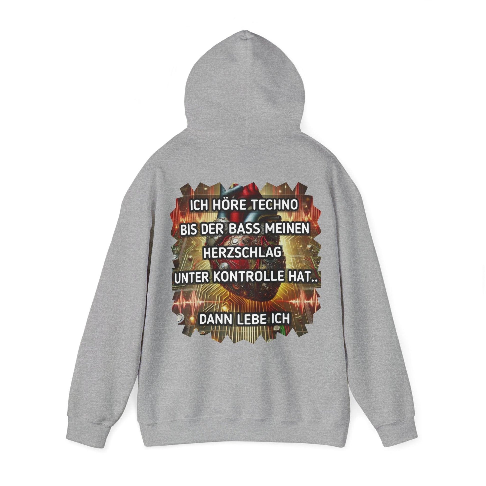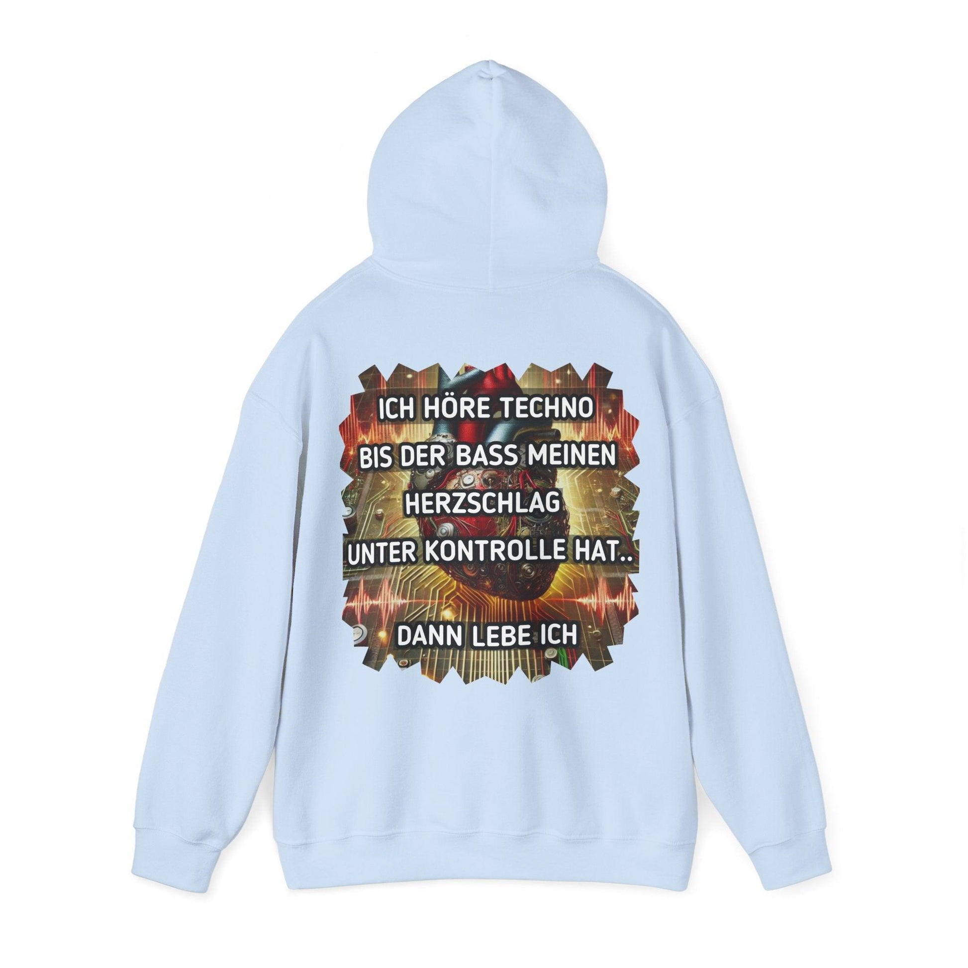 Dieser Hoodie zeigt eine Nahaufnahme eines schlagenden Herzens, das aus metallischen und elektronischen Elementen besteht und mit Kabeln und Schaltkreisen verflochten ist. Um das Herz herum sind Visualisierungen von Schallwellen und Frequenzlinien in lebhaften Farben wie Rot und Gold zu sehen. Der Hintergrund ist ein dynamisches Muster aus geometrischen Formen und Lichtern, das die Intensität und den Rhythmus der Techno-Musik widerspiegelt. Im Zentrum des Bildes steht der Text: „Ich höre Techno bis der Bass meinen Herzschlag unter Kontrolle hat.. Dann lebe Ich“. Dieser Hoodie ist perfekt für Techno-Musik-Enthusiasten, die ihre Liebe zum Genre durch einzigartige und lebendige tragbare Kunst ausdrücken möchten. Ideal für Musikfestivals, Konzerte und den lässigen Alltag.