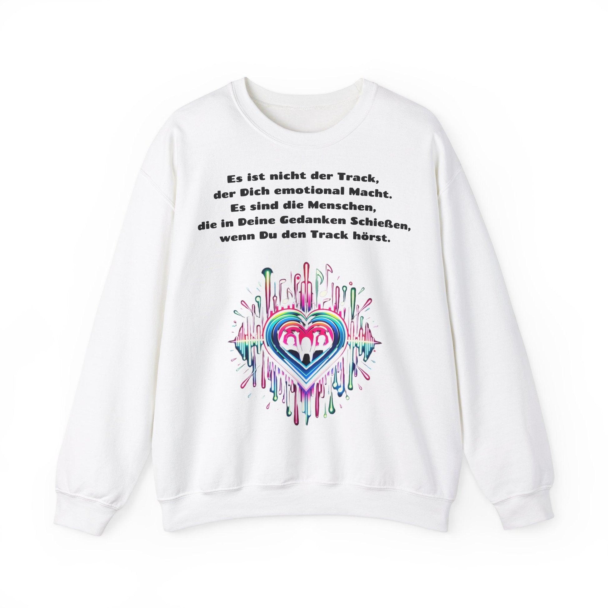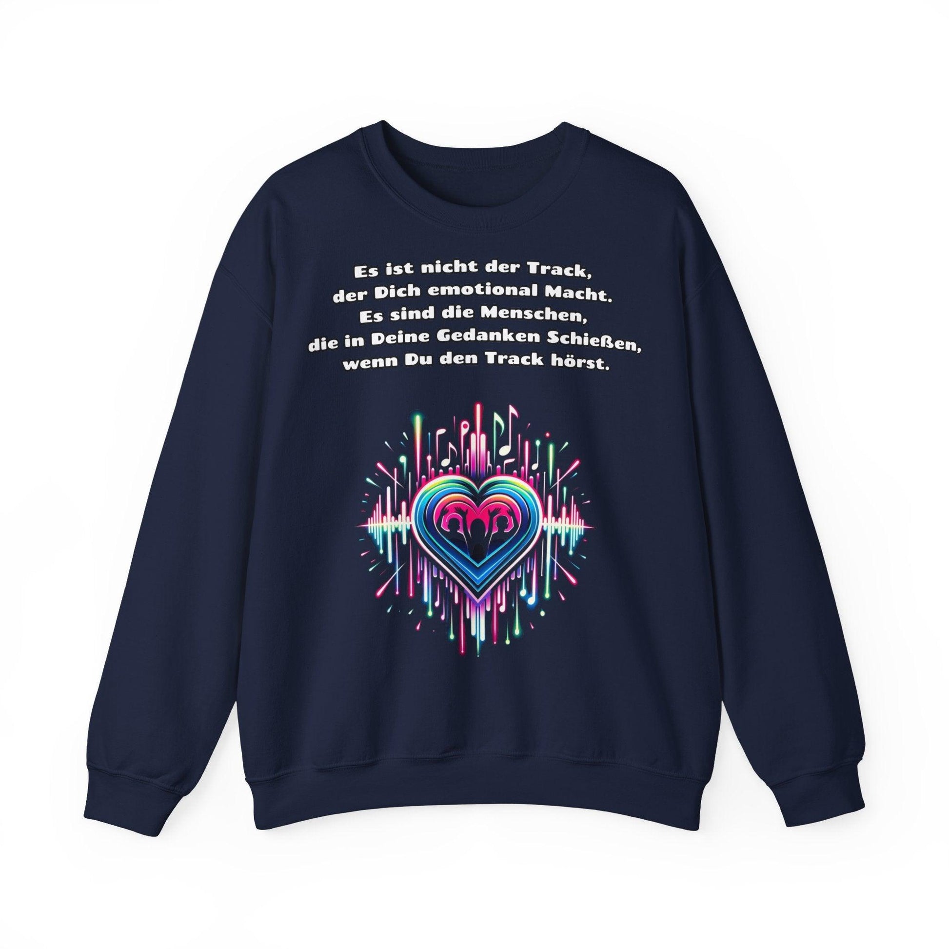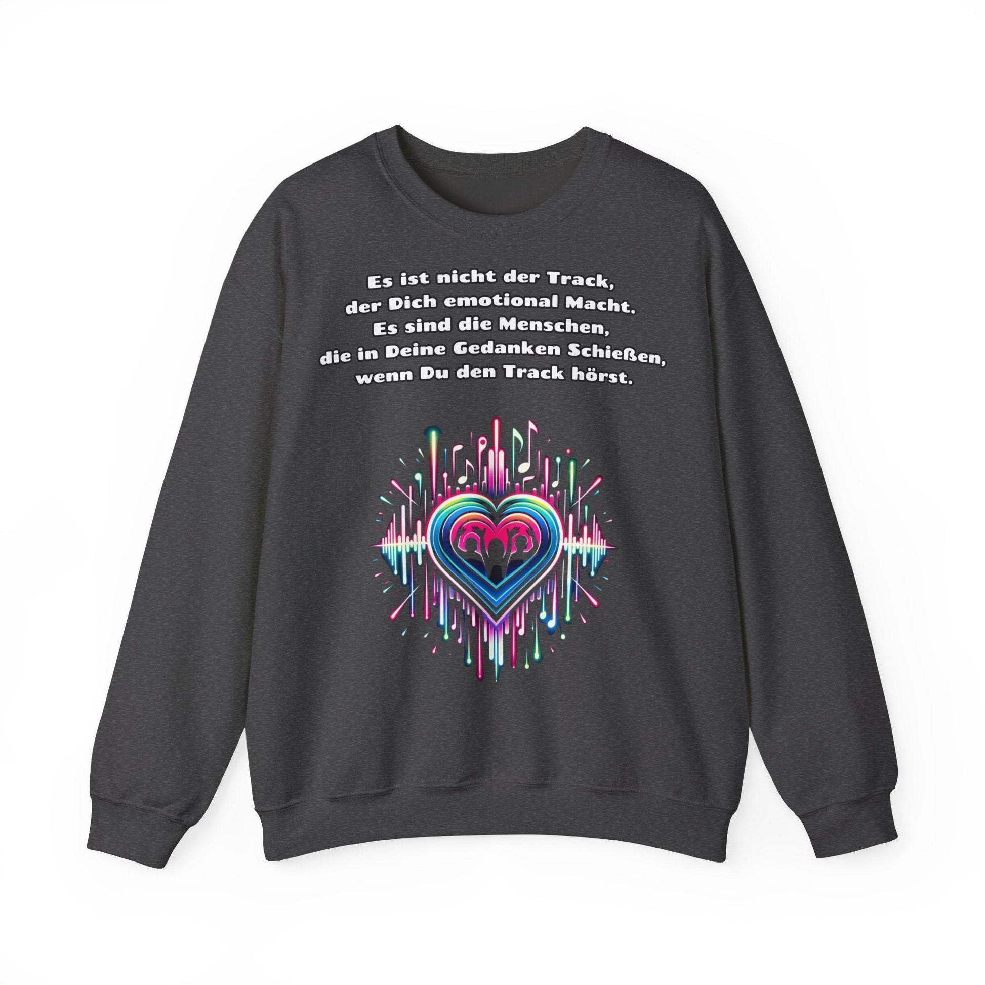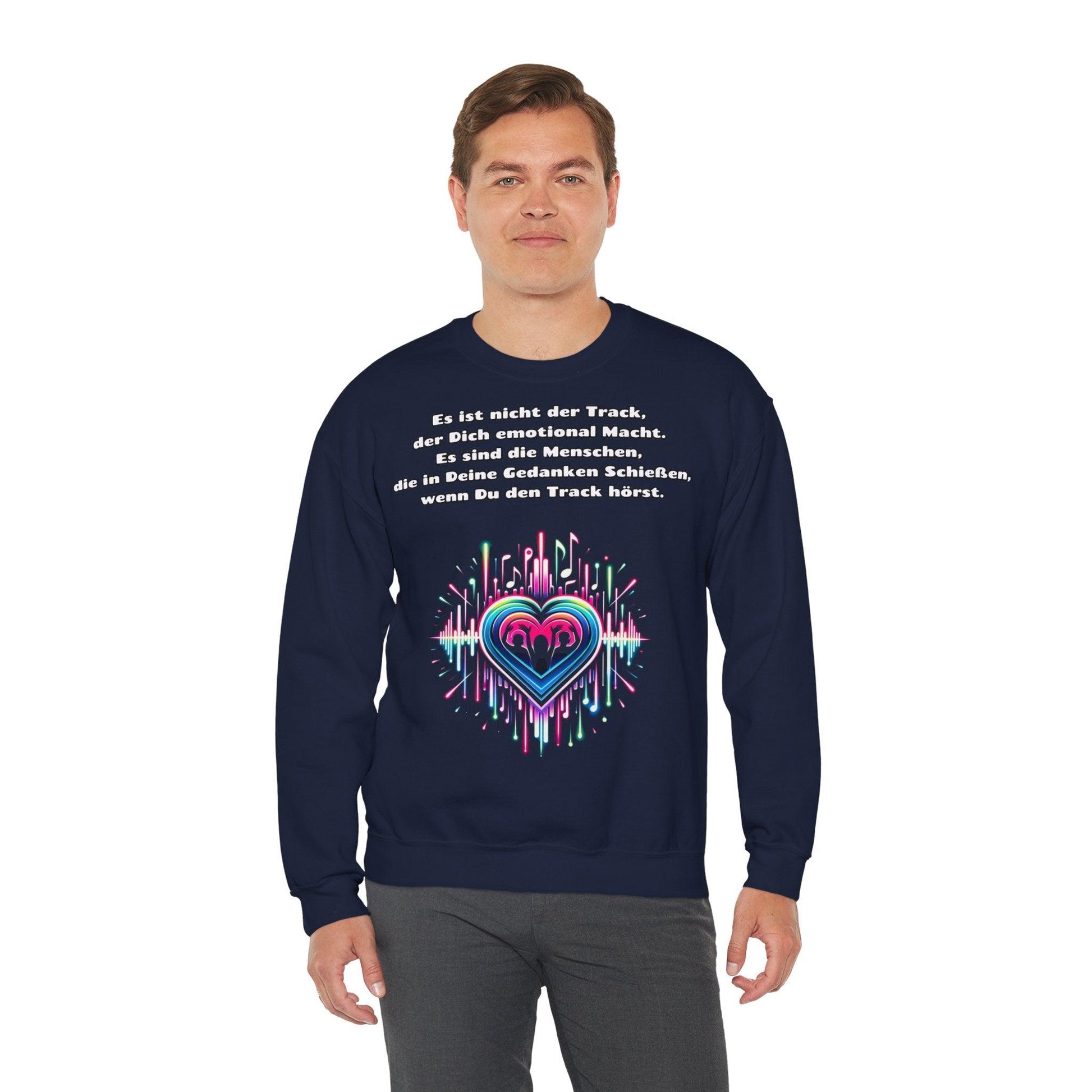 Ein Unisex-Sweatshirt aus schwerer Baumwolle mit einem Herz, das von pulsierenden Techno-Schallwellen umgeben ist. Zwischen den Schallwellen tauchen Silhouetten von Menschen auf, die die emotionale Verbindung zu Erinnerungen an bestimmte Personen symbolisieren, die durch Musik ausgelöst werden. Über dem Design steht der Satz: „Es ist nicht der Track, der dich emotional macht. Es sind die Menschen, die dir in den Sinn kommen, wenn du den Track hörst.“ Dieses Sweatshirt strahlt eine lebendige und energiegeladene Atmosphäre aus, perfekt für Musikliebhaber und alle, die einzigartige, künstlerische Visuals schätzen. Ideal zum Tragen auf Musikfestivals, Konzerten oder bei entspannten Treffen mit Freunden.
