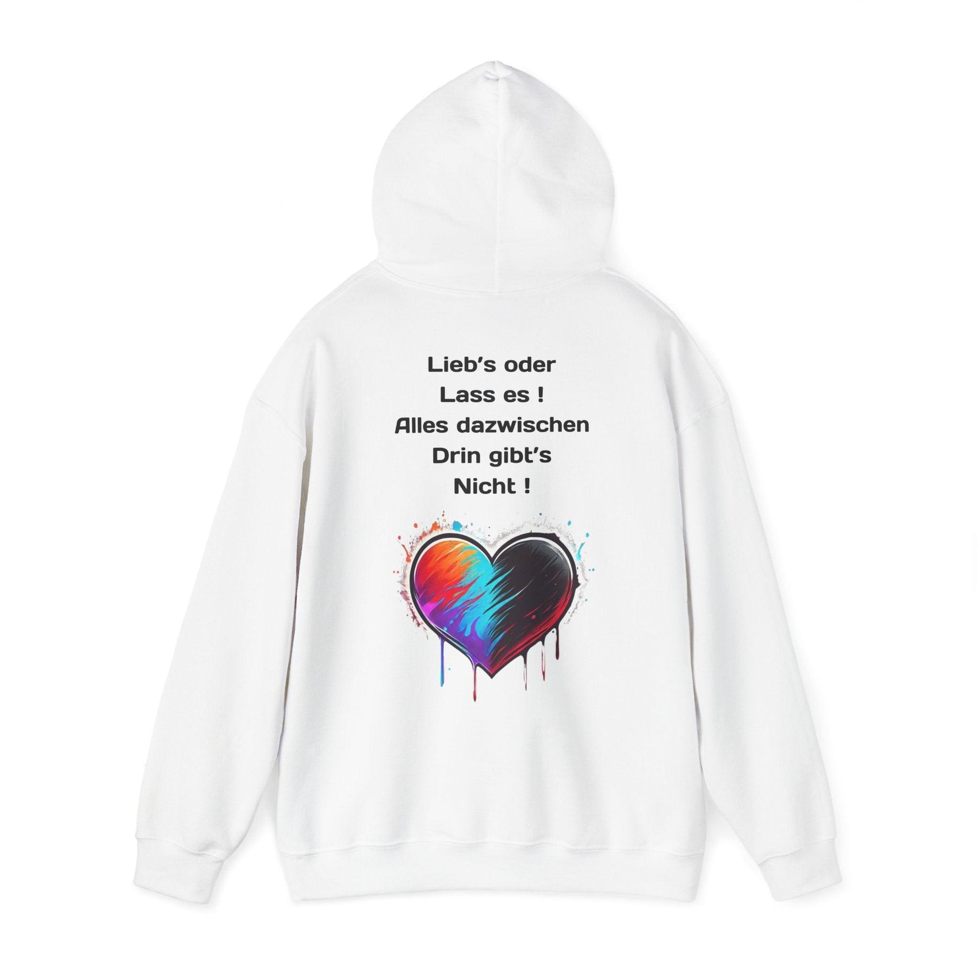 Ein einzigartiger Hoodie mit einem geteilten Herzdesign, das ein gespaltenes Herz zeigt: eine Seite hell und farbenfroh, die „Love it“ symbolisiert, während die andere Seite dunkel und verblasst ist und „Leave it“ darstellt. Der Kontrast visualisiert die klare Entscheidung zwischen „alles oder nichts“. Am oberen Rand des Herzens steht der Satz „Lieb's oder lass es. Alles dazwischen Drin gibts nicht.“ Dieser Hoodie strahlt eine moderne und mutige Ausstrahlung aus, perfekt für alle, die einzigartige und markante Designs schätzen. Es kann ein echter Gesprächsstarter sein und ein Statement-Piece beim Feiern auf Partys und für legere Ausflüge. Ideal für den Valentinstag, Jahrestage oder für diejenigen, die unkonventionelle Liebesthemen mögen.